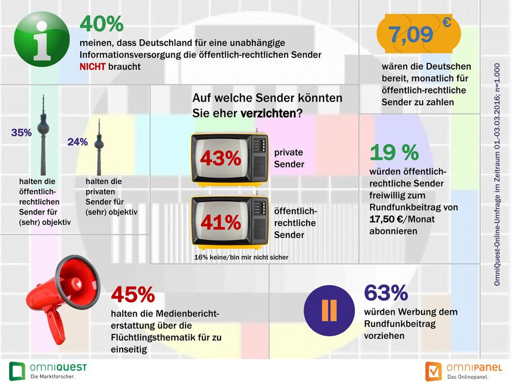 Der Rundfunkbeitrag steht bei der Bevölkerung stark in der Kritik. Mehr als 60 Prozent der Deutschen würden Werbung dem Rundfunkbeitrag vorziehen. Nur zwei von zehn Befragten würden öffentlichrechtliche Sender freiwillig zum Rundfunkbeitrag von 17,50€ abonnieren. Fast die Hälfte (45 Prozent) hält die Medienberichterstattung zur Flüchtlingsthematik für "zu einseitig"