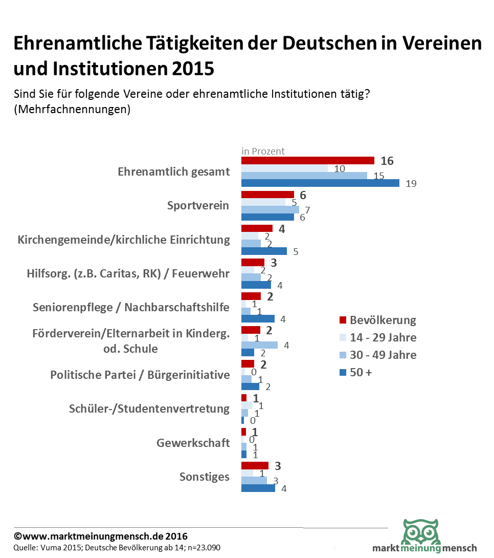 16 Prozent der Deutschen sind ehrenamtlich in Vereinen und Institutionen tätig. Bei den Jungen sind in Deutschland 10 Prozent, in der Generation 50+ sogar 19 Prozent, ehrenamtlich aktiv. Die Infografik zeigt die Statistik aus einer Umfrage zu den ehrenamtlichen Aktivitäten der Deutschen nach Altersgruppen.