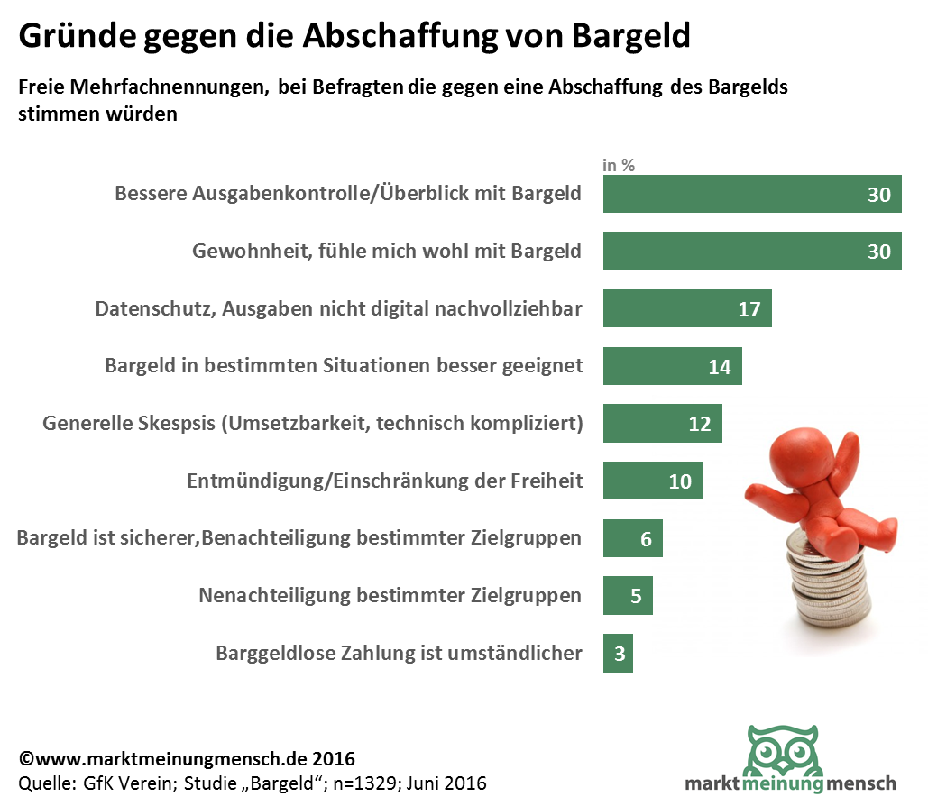 Die Infografik zeigt die Ergebnisse einer Umfrage zu den Gründen gegen eine Abschaffung des Bargeldes bei den Bargeldabschaffungs-Gegnern in Deutschland. 64 Prozent der Deutschen sind gegen die Abschaffung des Bargelds. Ausgabenkontrolle und Gewohnheit sind die häufigsten Argumente gegen eine bargeldlose Gesellschaft.