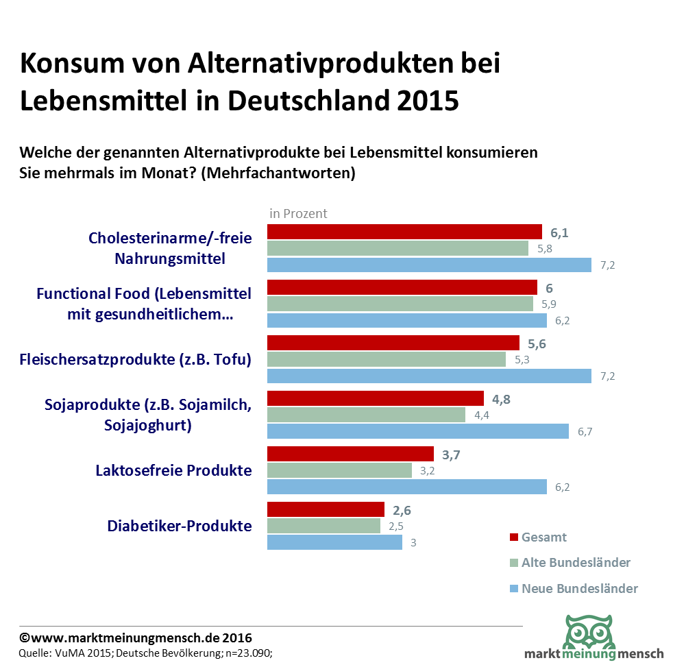 Die Infografik zeigt die Statistiken einer Umfrage zu Konsum alternativer Lebensmittel in Deutschland in den alten und neuen Bundesländern. In den neuen Bundesländern werden Alternativprodukte signifikant häufiger konsumiert.