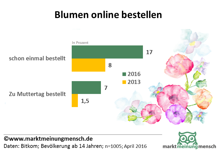 Laut einer Umfrage von Bitkom planen 2016 7 Prozent der Deutschen zu Muttertag Blumen online zu bestellen. 2013 waren es erst 1,5 Prozent. Immerhin haben 2016 schon 17 Prozent der Bevölkerung mindestens einmal online Blumen bestellt.