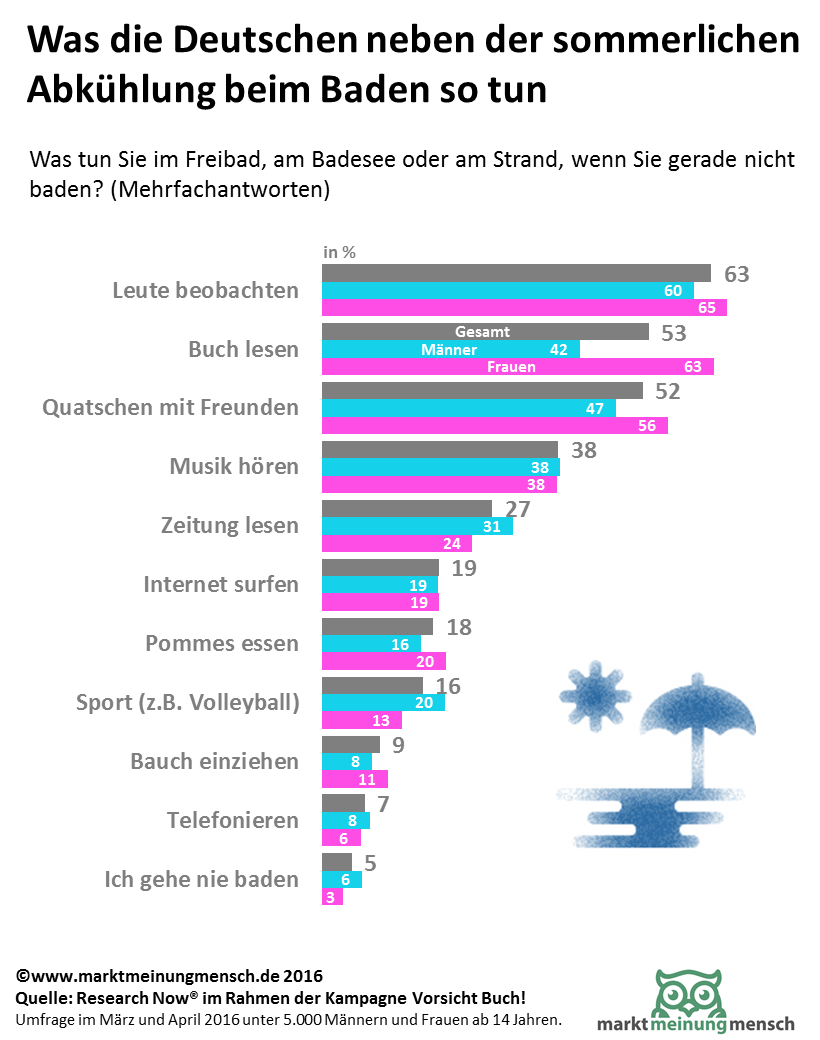 Leute beobachten, ein gutes Buch lesen und mit Freunden quatschen sind die Lieblingsbeschäftigungen der Deutschen im Schwimmbad. Das Smartphone und das Internet bleiben bei den meisten in der Badetasche. Das zeigt eine Umfrage von Research Now im Auftrag von Vorsicht Buch!