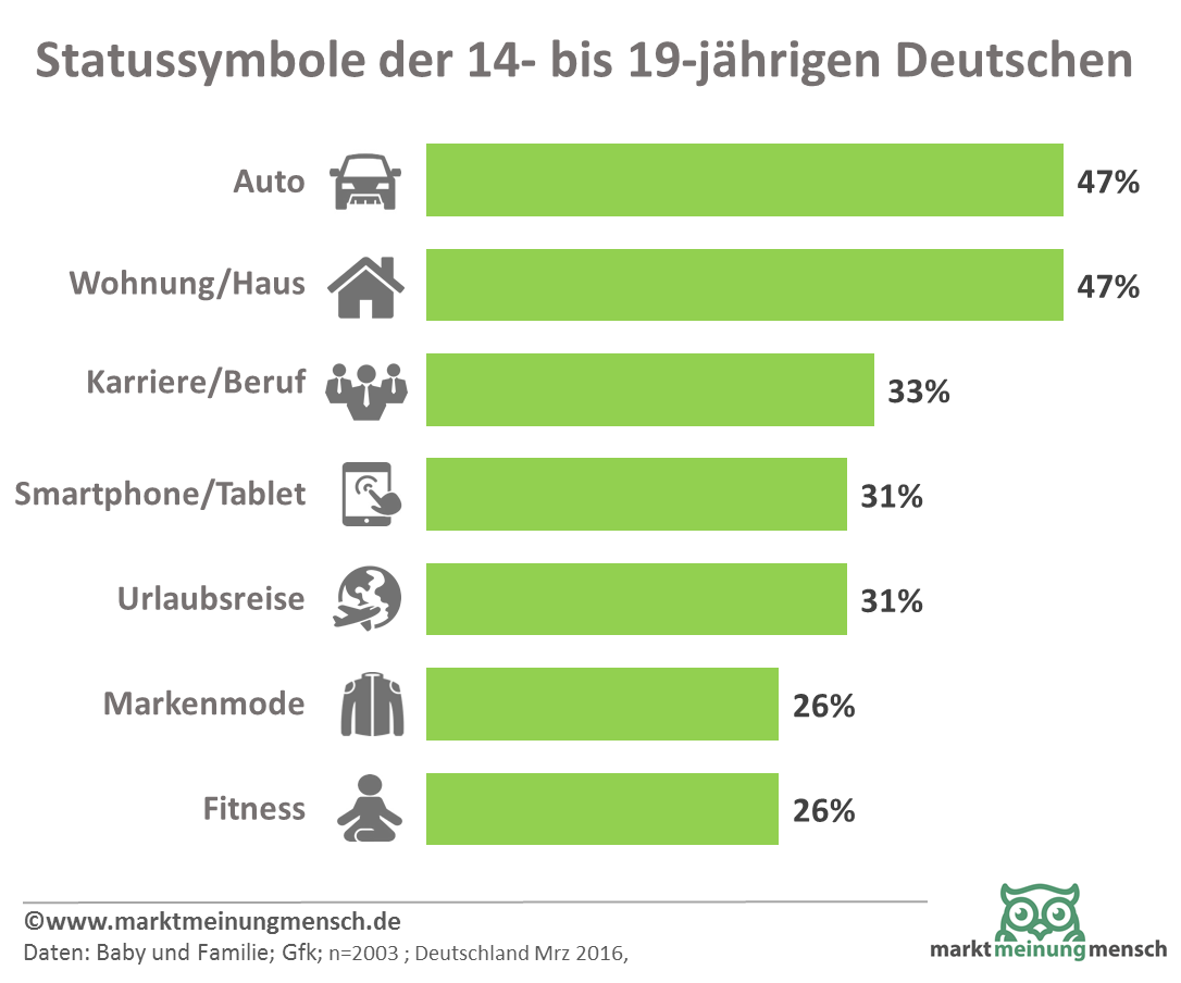 Das eigene Auto und die eigenen vier Wände sind mit Abstand die wichtigsten Statussysmbole der deutschen Teenies. Karriere kommt da erst an dritter Stelle - fast gleichauf mit Smartphone und Tablets.