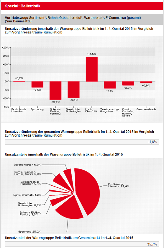 Der Umsatz mit belletristischer Literatur ist im Jahr 2015 in den vier Vertriebswegen Sortiment, Bahnhofsbuchhandel, Warenhaus und E-Commerce leicht um 1,6 Prozent gesunken. Der Marktanteil der traditionell größten Warengruppe blieb dabei im Vergleich zum Vorjahr mit 35,7 Prozent exakt auf dem gleichen Niveau (2013: 37,1 Prozent, 2012: 38,5 Prozent).Der leichte Umsatzrückgang ist vor allem auf das zweitgrößte Untersegment der Belletristik – die Spannung (Anteil 25,2 Prozent) – zurückzuführen. Mit Krimis & Co wurden 3,5 Prozent weniger Umsatz generiert als im Jahr zuvor.