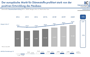Mit einem Umsatz von über 10,1 Milliarden Euro und einer verkauften Menge von knapp 184 Mio. Kubikmeter konnte der Markt für Dämmstoffe in Europa 2017 um 5,2% in Menge und 9,4% im Wert, zulegen. Bis 2020 steigt der Markt in den 11 untersuchten europäischen Märkten um durchschnittlich 7,5% pro Jahr in Wert, wie eine neue Studie von Interconnection Consulting zeigt.