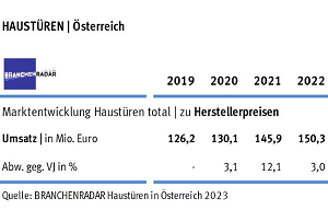 Nur Dank steigender Verkaufspreise schaffte der österreichische Markt für Haustüren im Jahr 2022 ein Umsatzplus. Die Einnahmen aus dem Verkauf von Kunststofftüren sanken dennoch, zeigen aktuelle Daten einer Marktstudie von BRANCHENRADAR.com