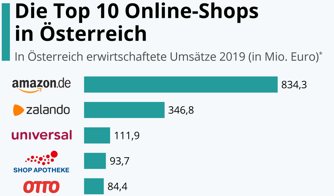 Auch 2019 ist Amazon in Österreich mit rund 834 Millionen Euro Umsatz der erfolgreichste Online-Shop der Alpenrepublik. Erst mit weitem Abstand folgt der deutsche Modehändler Zalando (346,8 Millionen Euro) vor dem heimischen Generalisten Universal (111,9 Millionen Euro). Daneben hat es mit e-tec.at nur noch ein weiterer Anbieter aus dem eigenen Land in die Top 10 geschafft. Das Ranking ist Teil der Studie „E-Commerce-Markt Österreich 2020“ von EHI und Statista. Die Erhebung analysiert bereits zum zehnten Mal die 250 größten Online-Shops des Landes.