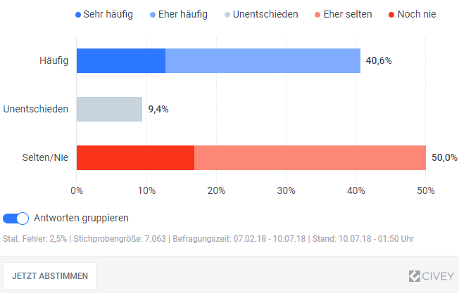 40,6 Prozent der Bundesbürger haben sich in der Vergangenheit „häufig“ im Internet über ärztliche Behandlungsmöglichkeiten informiert. Mit 46,4 Prozent bestätigten dies besonders oft die Bundesbürger zwischen 30 und 39 Jahren. Eine Mehrheit von 50 Prozent informiert sich hingegen „selten“ oder „nie“ über Behandlungsmöglichkeiten online.