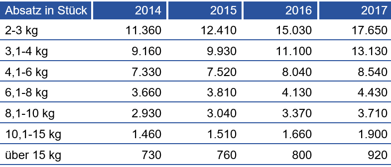 Der Boom von Drohnen erfasst alle Gewichtsklassen, der stärkste Nachfrageschub von +22,3 Prozent geg. VJ betrifft dabei Multicopter mit einem Eigengewicht von zwei bis drei Kilogramm. Aber auch die Gewichtsklassen von drei bis vier Kilogramm sowie von vier bis sechs Kilogramm wachsen rasant mit jeweils knapp unter zwanzig Prozent geg. VJ. Erst ab den Gewichtsklassen ab sechs Kilogramm flacht die Aufwärtsbewegung markant ab, durchschnittlich werden aber auch hier in allen Gewichtsklassen Nachfragesteigerungen von rund zehn Prozent geg. VJ erzielt.