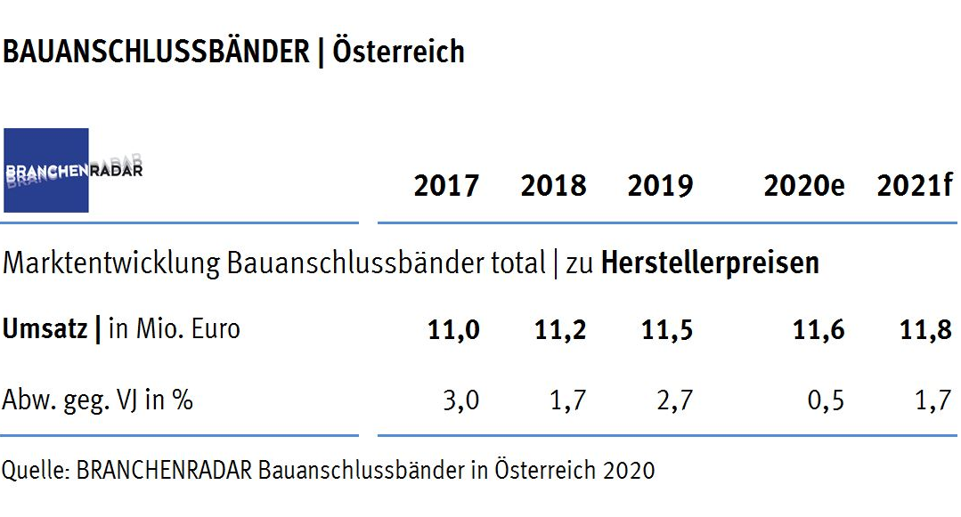 Der Aufschwung am Markt für Bauanschlussbänder setzte sich im vergangenen Jahr fort. Laut aktuellem BRANCHENRADAR Bauanschlussbänder in Österreich 2020 erhöhte sich der Herstellerumsatz um 2,7 Prozent gegenüber Vorjahr auf rund 11,5 Millionen Euro.