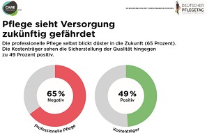 Die Infografik zeigt die Statistik einer Umfrage unter Pflegern und Kostenträgern in Deutschland. Die professionelle Pflege blickt düster in die Zukunft (65 Prozent). Die Kostenträger ...