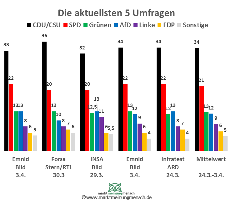 marktmeinungmensch bietet wöchentlich die 5 aktuellsten Umfrageergebnisse zur Bundestagswahl - unkommentiert und übersichtlich.