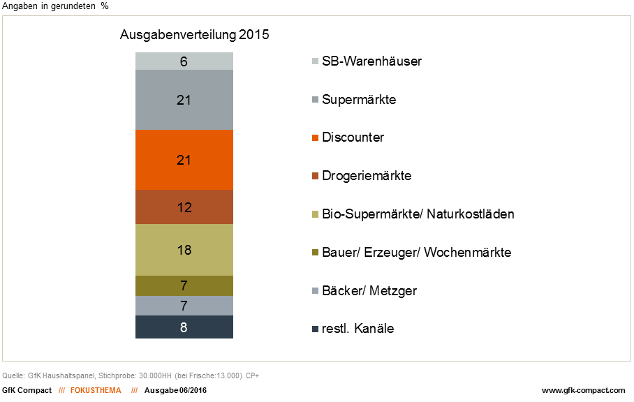Im Jahr 2015 lag der Bio-Anteil an den gesamten Lebensmittelausgaben inklusive Getränke bei 4,7 Prozent. Das ist kein hoher Wert doch der Anteil ist damit innerhalb der vergangenen 11 Jahre um das Zweieinhalbfache gewachsen. Dies zeigen die Ergebnisse des GfK-Haushaltspanels, in dem 30.000 Haushaltsführende regelmäßig über ihre gesamten Einkäufe täglicher Verbrauchsgüter berichten. Ein rasantes Wachstum fand in den Jahren 2004 bis 2008 statt, in denen sich der Bio-Anteil an den Lebensmittelausgaben in Deutschland mehr als verdoppelte (von 1,4 Prozent in 2004 auf 3,2 in 2008). In den darauf folgenden Jahren machte sich offenbar die Wirtschaftskrise bemerkbar. Erneutes, größeres Wachstum gab es erst wieder ab 2011. Auch die jüngste Entwicklung von 2014 auf 2015 bringt einen Sprung von 0,4 Prozentpunkten an den gesamten Lebensmittelausgaben. Dies bedeutet einen Anstieg von 10 Prozent innerhalb des Bio-Lebensmittelsektors und beweist, dass hier noch immer Wachstum möglich ist, denn dieses Plus kam zum größten Teil durch mehr gekaufte Ware und nur zu einem sehr geringen Teil durch gestiegene Preise oder den Wechsel zu höherpreisigen Produkten zustande.
