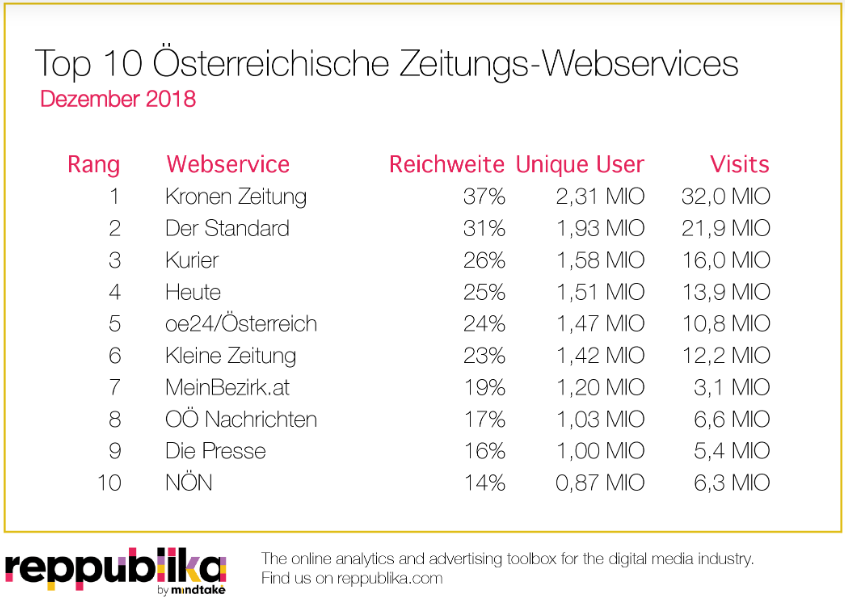 Das Webangebot (Websites und Apps) von Krone.at ist im Dezember 2018 wieder das reichweitenstärkste unter den Zeitungsportalen im österreichischen Web-Universum. Knapp dahinter landet das Webangebot von DerStandard.at und Kurier. Das Researchtool Reppublika liefert mit seiner Funktion Ratings+ eine Vielzahl an Auswertungen für die Mediaplanung.