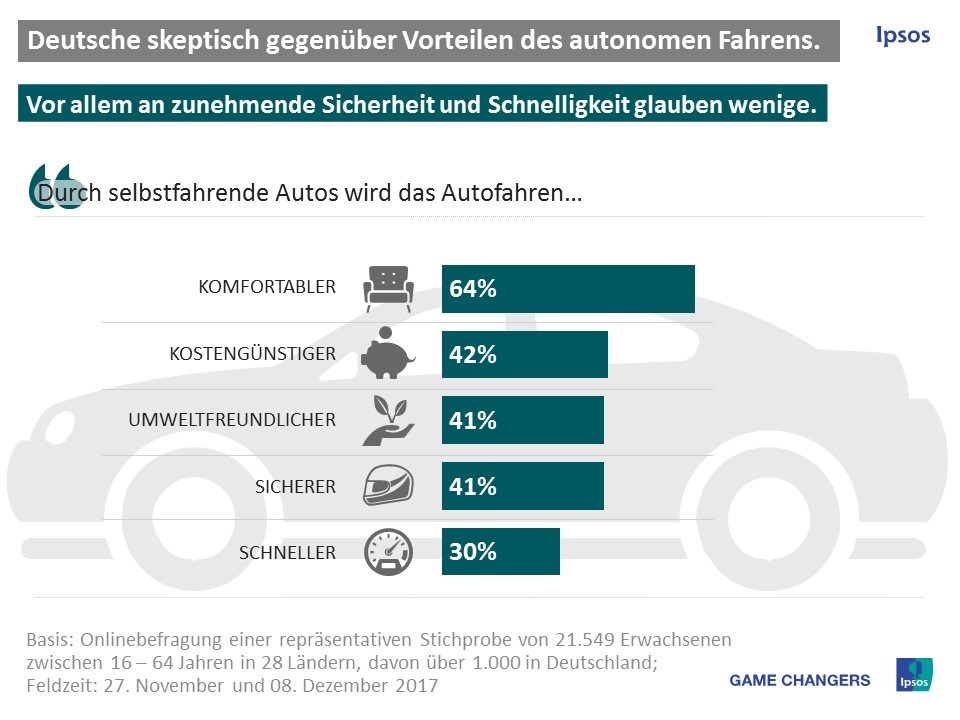 Jeder dritte Deutsche lehnt es ab, zukünftig ein selbstfahrendes Fahrzeug zu nutzen. Die Bundesbürger gegegnen dem autonomen Fahren laut einer repräsentativen Umfrage des Markt- und Meinungsforschungsinstituts Ipsos in 28 Ländern weltweit mit der größten Ablehnung.