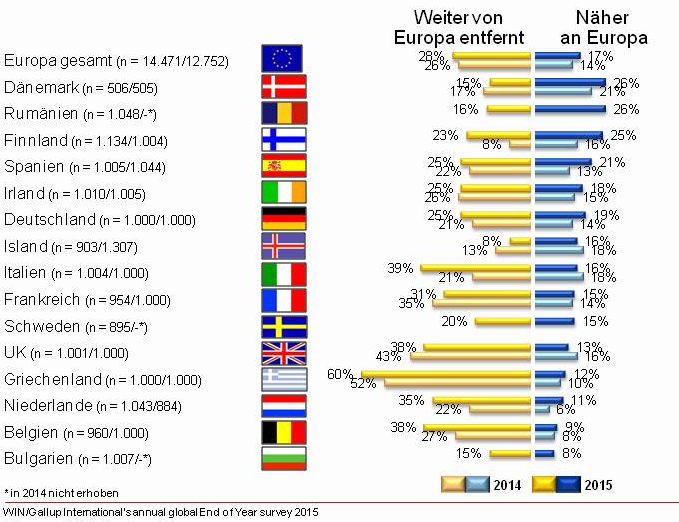 Die Frage, ob sie sich in den vergangenen zwölf Monaten die Europäer näher oder von Europa weiter entfernt gefühlt haben, stand im Zentrum einer Umfrage in 15 Ländern Europas.