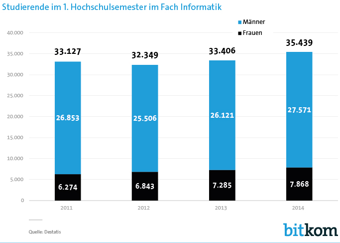 Der Anteil der Studienanfängerinnen in den Informatik-Studienangeboten stieg von 19 Prozent 2011 leicht an. 2014 waren von 35.500 Studienanfängern 7.900 Frauen (22 Prozent)