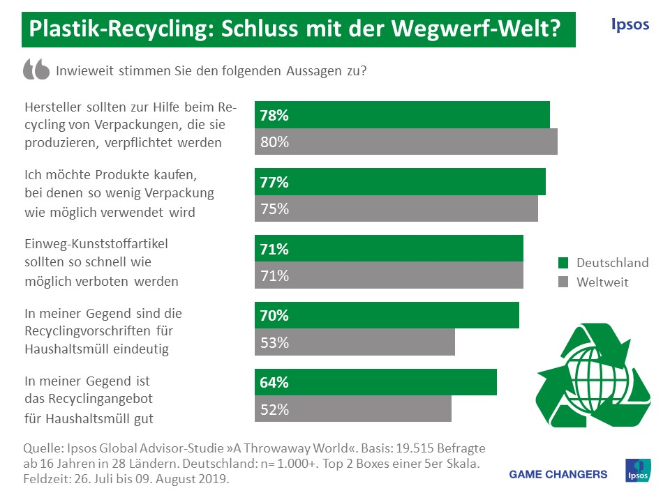 Am deutschen Recyclingsystem wird im Gegensatz zu den meisten anderen Ländern relativ wenig Kritik geäußert. Fast zwei von drei Bundesbürgern sind der Überzeugung, dass das hiesige Recyclingangebot für Haushaltsmüll in der Gegend, in der man lebt, gut ist – nur jeder fünfte Deutsche (21%) ist da anderer Meinung. Am positivsten bewerten Kanadier und Schweden (je 70%) das Recyclingangebot im eigenen Land, die größten Defizite in diesem Bereich werden in Russland (24%) und Serbien (22%) beklagt.