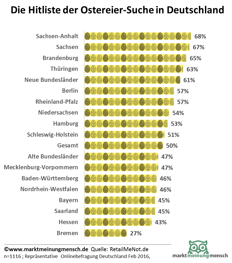Mehr als drei Viertel der Deutschen pflegen Osterbräuche. Die größten Osterbräuche-Fans finden sich in Brandenburg, Sachsen-Anhalt und Rheinland-Pfalz - 87 Prozent der Menschen gehen dort entsprechenden Traditionen nach. Beim Suchen und Verstecken von Ostereiern - mit 50 Prozent der beliebteste Osterbrauch der Deutschen - haben die Sachsen die Nase vorne und Bremen ist Schlusslicht. Dies - und noch mehr Zahlen, Daten und Fakten - ergab eine repräsentative Umfrage von RetailMeNot