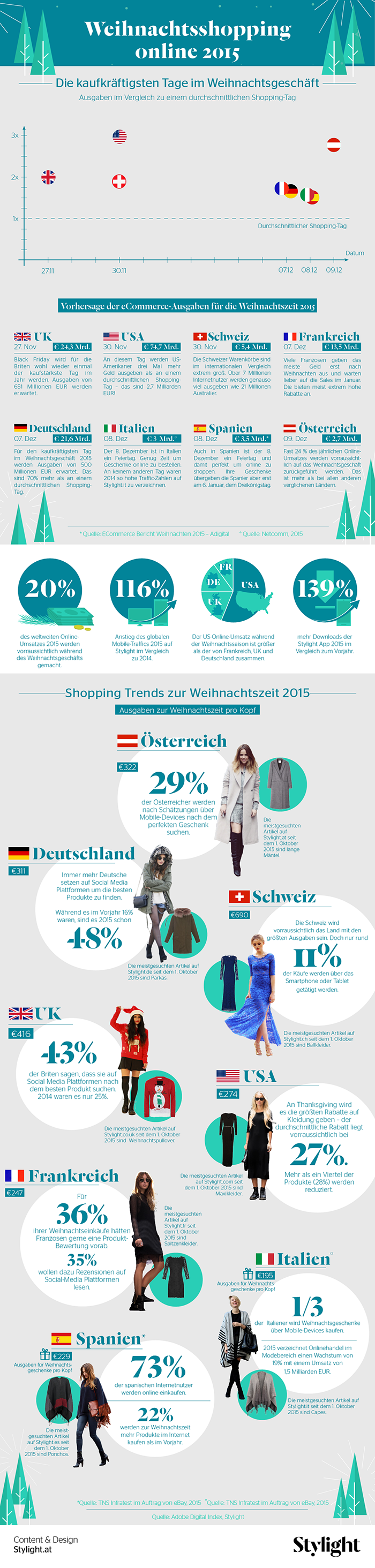 Stylight hat eine Prognose-Übersicht zum Weihnachtsgeschäft und den Shopping-Trends in der Zeit bis Weihnachten 2015 erstellt: In Österreich dürfte der 9. Dezember der umsatzstärkste Tag werden. Damit erledigen die Österreicher ihre Weihnachtseinkäufe am spätesten. US-Amerikaner, Briten und Schweizer sind mit ihrem X-Mas Shopping am frühesten dran. Knapp 24 Prozent des diesjährigen Online-Umsatzes entfallen in Österreich voraussichtlich auf die Weihnachtszeit.