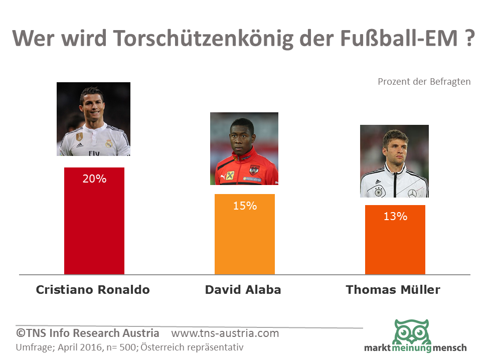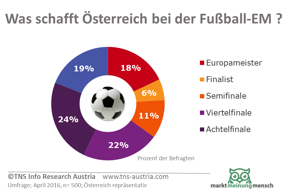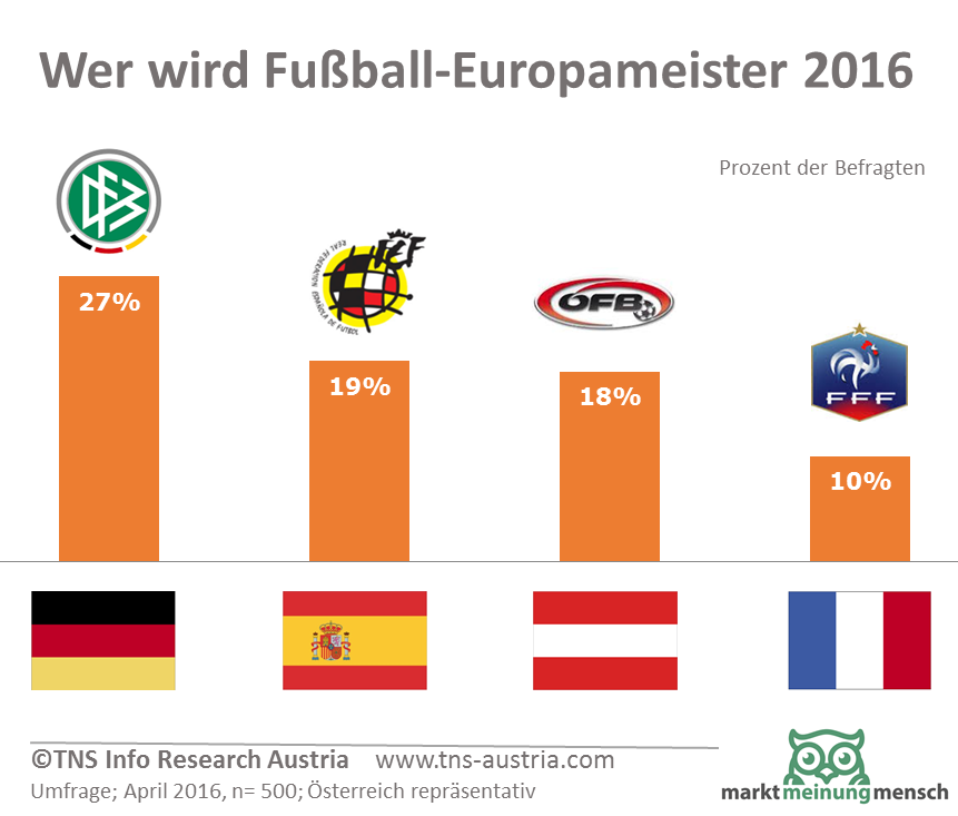 Wer wird Fußball-Europameister 2016? TNS Inforesearch Austria hat die Österreicher zum Thema UEFA Fussball-Europameisterschaft 2016 befragt. Deutschland ist dann doch mit 27 Prozent Top-Favorit. 18 Prozent der Österreicher meinen "wir schaffen das". Mehr als die Hälfte glauben zumindest an den Einzug des österreichischen Fußball-Nationalteams ins Viertelfinale.
