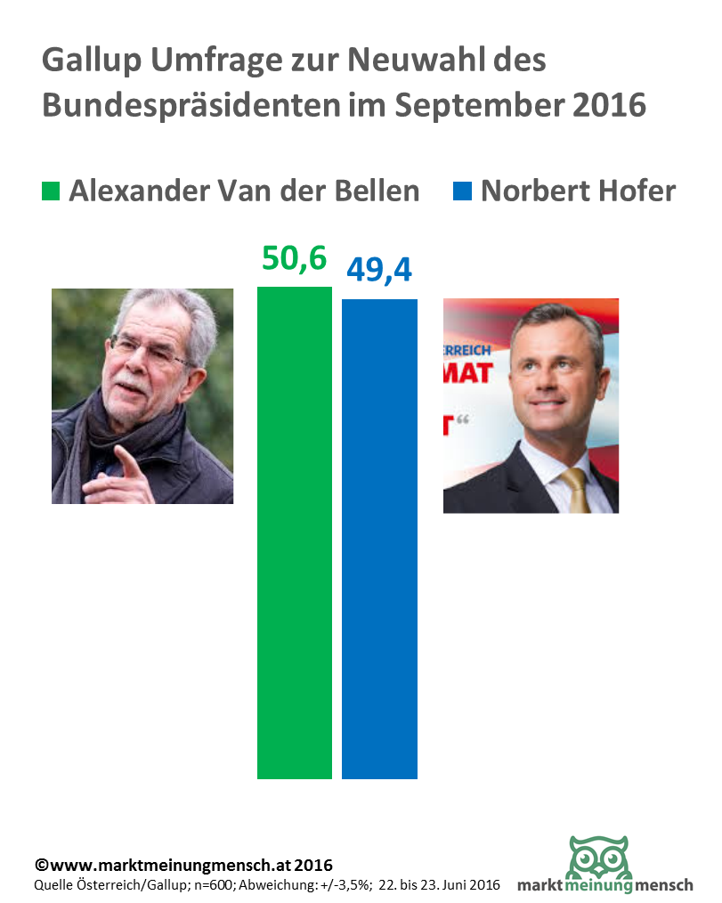 Wahlwiederholung! Noch vor der Entscheidung des Verfassungsgerichtshofes, aufgrund formaler Unregelmäßigkeiten bei der Wahlauszählung eine Wahlwiederholung der Stichwahl zum Bundespräsidenten anzuordnen, hat Gallup im Auftrag der Tageszeitung Österreich die Wähler zum Stimmverhalten bei einer Wahlwiederholung der Bundespräsidentschaftswahl 2016 befragt. Demnach liegt Alexander Van der Bellen mit 50,6 Prozent vor Norbert Hofer (49,3 Prozent). Eine Wiederholung des Kopf-an-Kopf-Rennens steht bevor.
