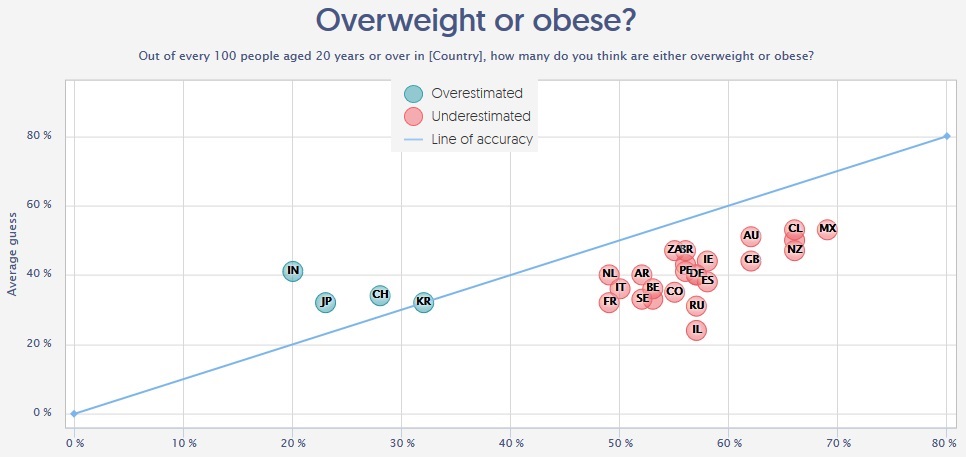 Der Anteil der Übergewichtigen Menschen wird in fast allen Ländern stark unterschätzt. In Saudi-Arabien meinen die Befragten der Anteil der Dicken liegt bei 28 Prozent - laut Statistik sind es 71 Prozent! Die Deutschen glauben 40 Prozent ihrer Mitbürger sind übergewichtig oder fettleibig. Die deutsche Statistik zählt 57 Prozent Übergewichtige. In den Ländern mit dem geringsten Anteil an Dicken, überschätzen die Menschen den Anteil der Übergewichtigen. So halten 40 Prozent der Inder ihre Landsleute für übergewichtig, in Wirklichkeit sind es nur 20 Prozent.